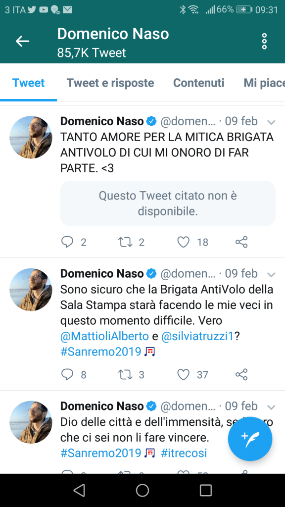 Contemporaneamente, il conduttore televisivo e disc jockey Francesco Facchinetti condivide sui social un video accompagnato da un duro commento “Io vi prenderei a calci in culo fino alla fine del mondo: idioti, coglioni, buffoni”. Si scopre che i suoi insulti sono rivolti ad alcuni giornalisti della sala stampa ripresi mentre esultano per il terzo posto de Il Volo, alzando il pugno in segno di vittoria e urlando “merde”, “siete delle merde”, “fate schifo” e altri epiteti irripetibili all’indirizzo dei tre giovani cantanti. Poco dopo, viene diffuso un altro video in cui un giornalista grida “in galera” appena Il Volo, che interpreta il brano “Musica che resta”, appare sullo schermo gigante che ritrae i concorrenti in gara sul palco dell’Ariston. Un ben triste spettacolo vedere quest’uomo semi pelato e trasandato di mezza età inveire in modo sguaiato all’indirizzo di artisti intenti a cantare l’amore con tutta la passione della loro giovinezza. Sembra quasi l’immagine della contrapposizione tra bene e male, tra purezza e malvagità, tra eleganza e rozzezza.
