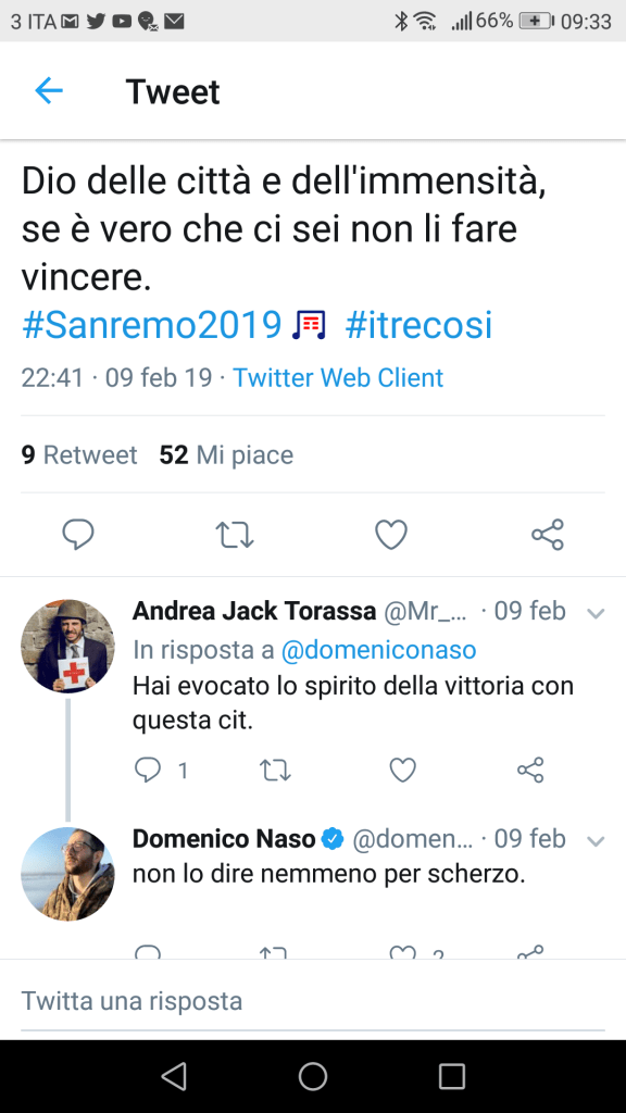 Questa reazione elegante, composta ed equilibrata suscita l’ammirazione di tutti, anche in considerazione del fatto che in conferenza stampa, a differenza di Ultimo, avevano mantenuto la calma pur sapendo di essere stati offesi ed avevano risposto educatamente alle domande dei giornalisti.
